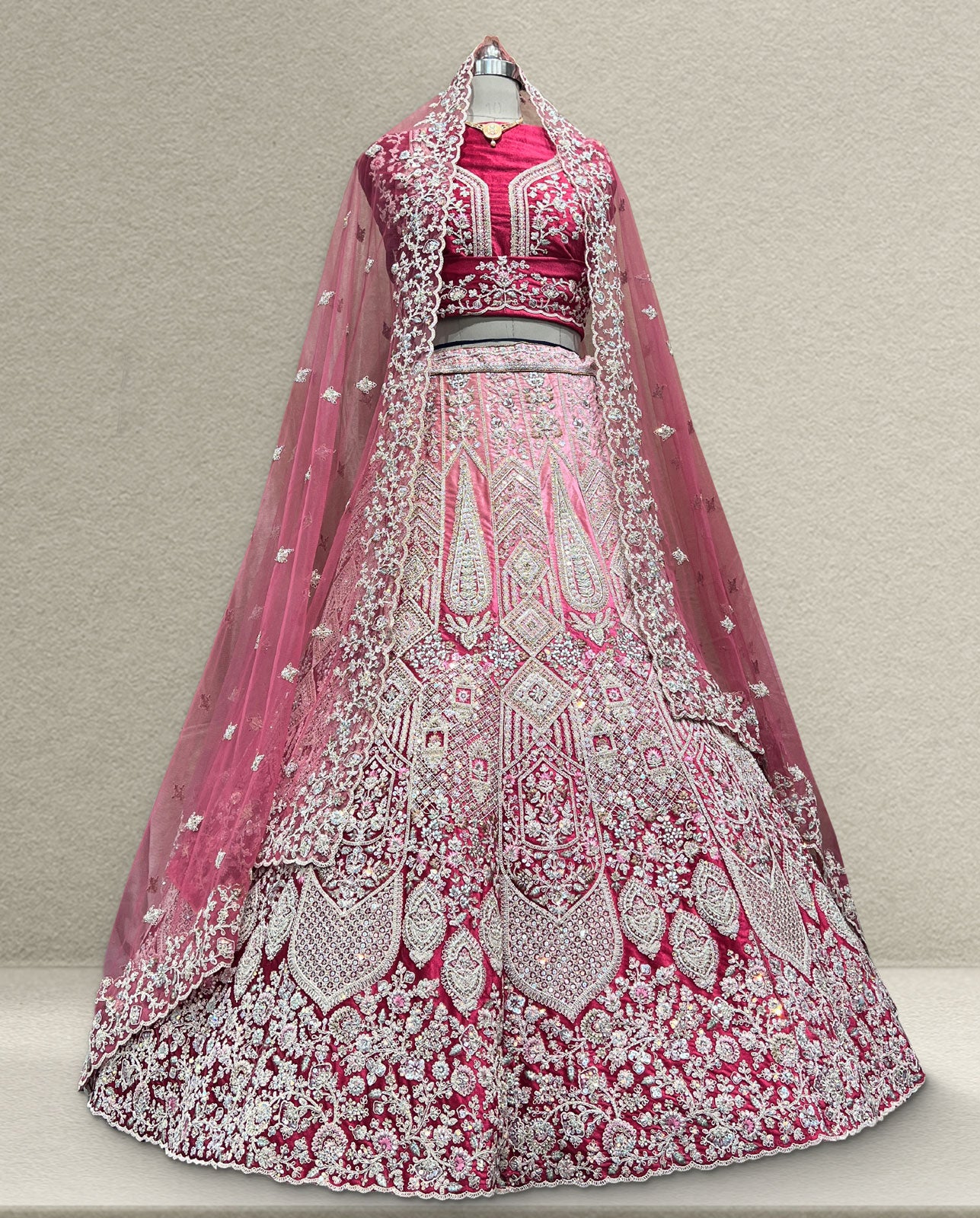Make a grand entrance on your wedding day with this breathtaking Magenta-Pink Bridal Lehenga. This masterpiece is designed for the modern bride who seeks a perfect balance between traditional royalty and contemporary sparkle.